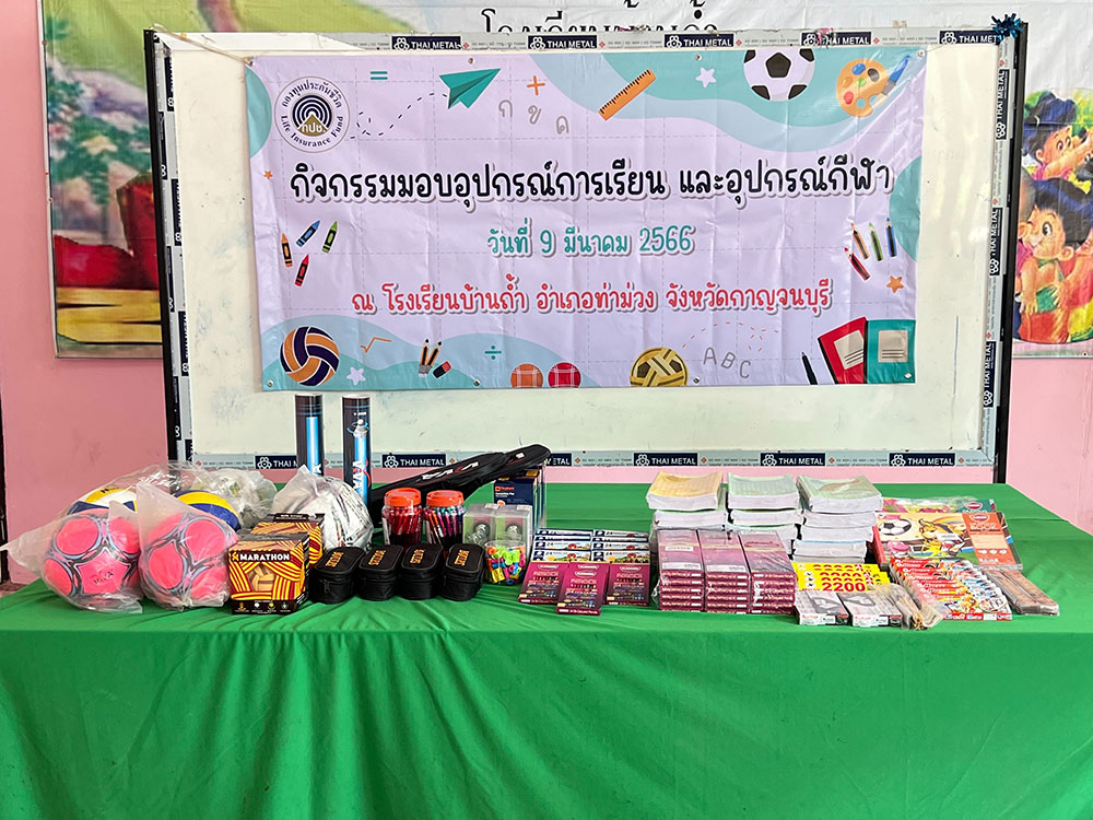 นายนพพล เบี้ยวไข่มุข ผู้จัดการกองทุนประกันชีวิต พร้อมด้วยบุคลากรกองทุนประกันชีวิตได้ร่วมทำกิจกรรมรับผิดชอบต่อสังคม (CSR) ด้วยการบริจาคอุปกรณ์การเรียนและอุปกรณ์กีฬาที่ขาดแคลนให้แก่คณะครู และนักเรียน ณ โรงเรียนบ้านถ้ำ อำเภอท่าม่วง จังหวัดกาญจนบุรี เมื่อวันที่ 9 มีนาคม 2566 เพื่อช่วยเหลือให้นักเรียนได้มีอุปกรณ์การเรียนและอุปกรณ์กีฬาที่มีคุณภาพและเพียงพอต่อการเรียนการสอน ตลอดจนช่วยส่งเสริมให้นักเรียนมีการพัฒนาทักษะในด้านกีฬาที่ดี มีน้ำใจนักกีฬา และมีสุขภาพร่างการที่แข็งแรง